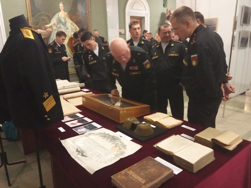На выставке был представлен к обозрению Морской устав 1720 года, составленный под руководством Петра I, который излагает правила порядка корабельной службы и определяет общую структуру и организацию русского флота. Он включает кодекс морских уголовных законов и описания военных сигналов. Во вступительной части, написанной Петром I при деятельном участии Феофана Прокоповича, излагается мысль о необходимости морских сил для укрепления военной мощи государства.