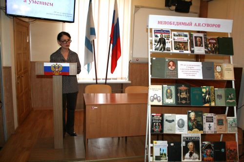 Об этом, а также о боевом пути, жизни и деятельности выдающегося полководца курсантам Черноморского ВВМУ имени П.С.Нахимова рассказала библиотекарь Л.И.Черепнина. Она же провела обзор литературы из фондов библиотеки повествующих о А.В.Суворове.